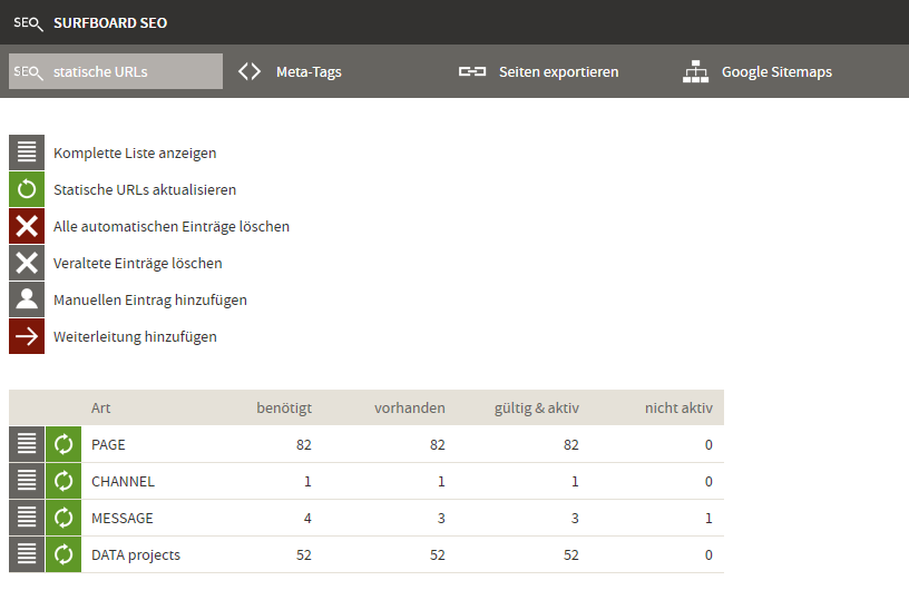 Klicken Sie auf surfboard SEO im Hauptmenü, um die Startseite des Moduls mit der Funktionsübersicht aufzurufen: